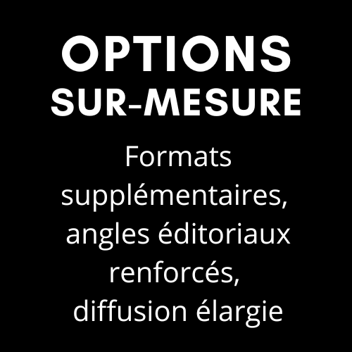 Un format éditorial pour révéler votre univers, avec des options cumulables pour renforcer votre visibilité. Des extensions de tournage, la récupération des rushs complets et des options sur-mesure sont disponibles pour amplifier votre présence. Bénéficiez également de nos leviers marketing, pour faire connaître le média (sponsoring, newsletters, sponsoring de contenu, relais newsletter, avantages lecteurs, coups de cœur, cartes cadeaux partenaires etc.)